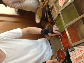 原了郭をこえる風味豊かな七味は長文屋。白胡麻、麻の実、青紫蘇、青海苔、けしの実、黒胡麻、山椒、唐辛子。ブレンドできます。