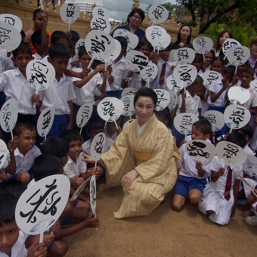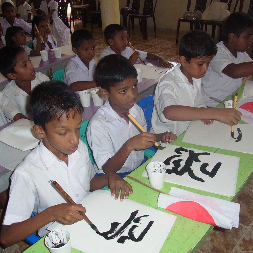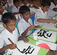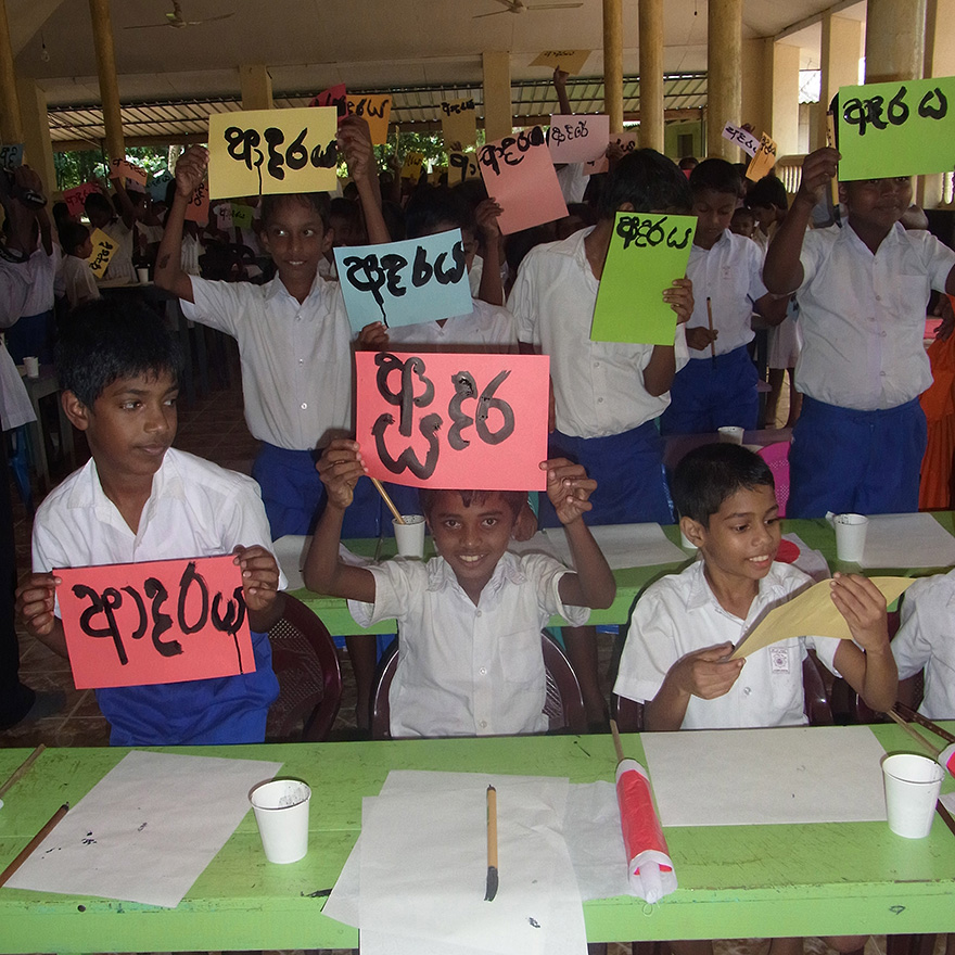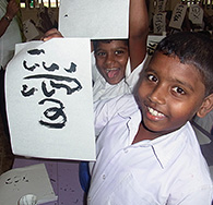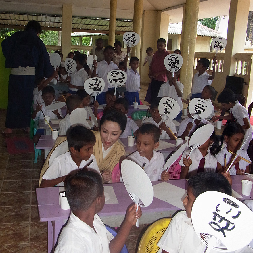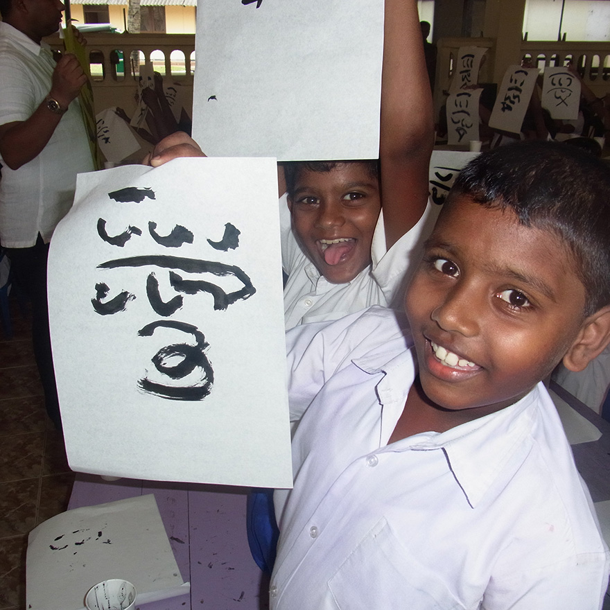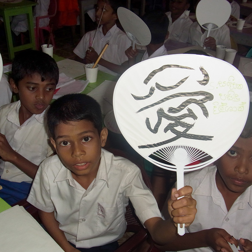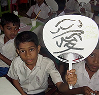 今回は、日本の震災にあった子供達へのメッセージとして、15世紀頃にできたといわれるスリランカの文字「シンハラ語」で「愛」を書いてもらいました。 スリランカにはないという日本伝統の「団扇」にも「愛」を書き、子供達はパワーあふれる素晴らしい作品を仕上げてくれました。