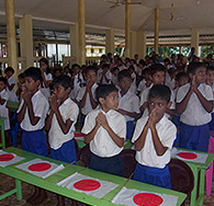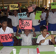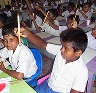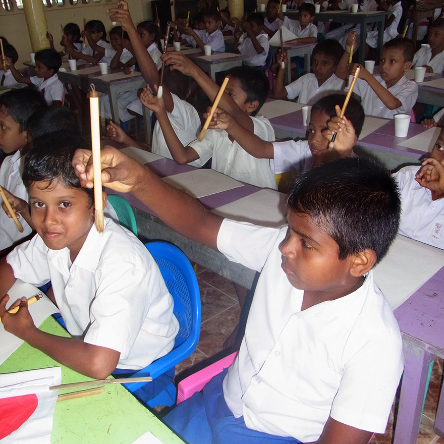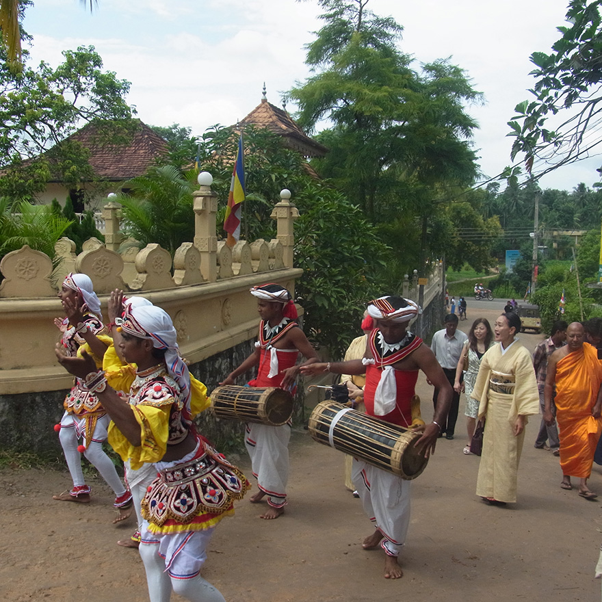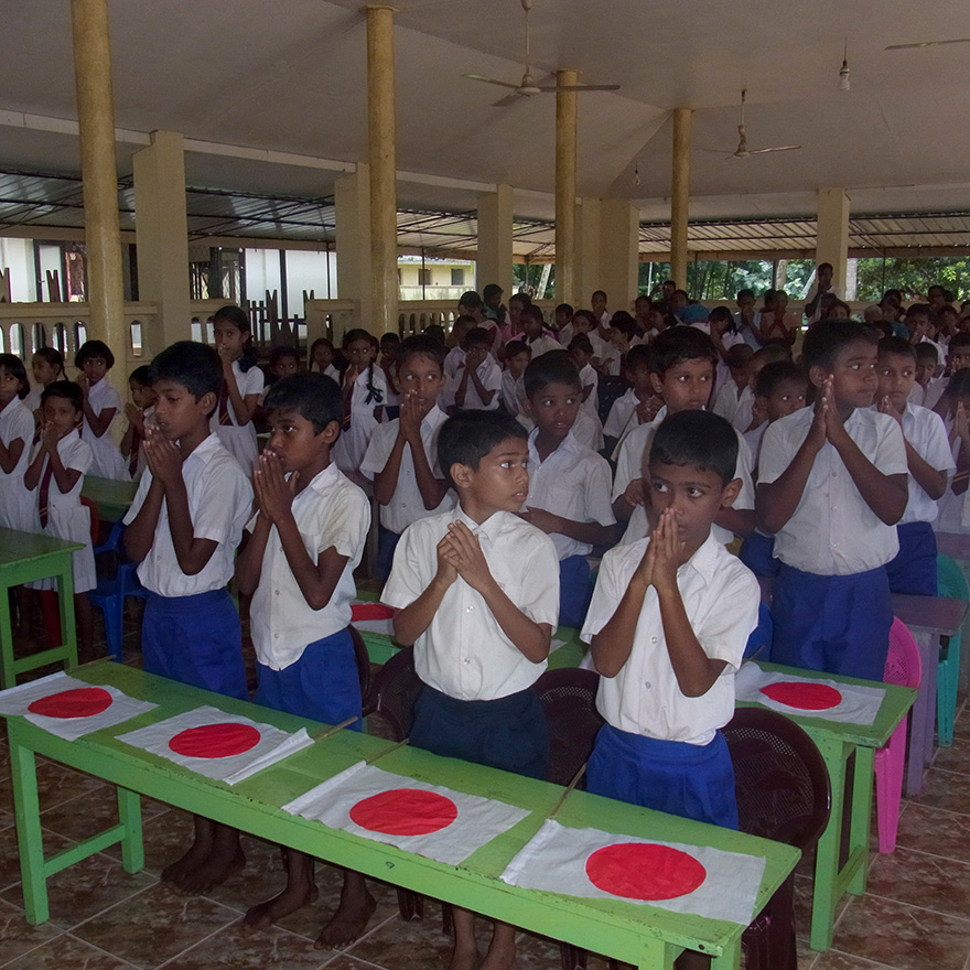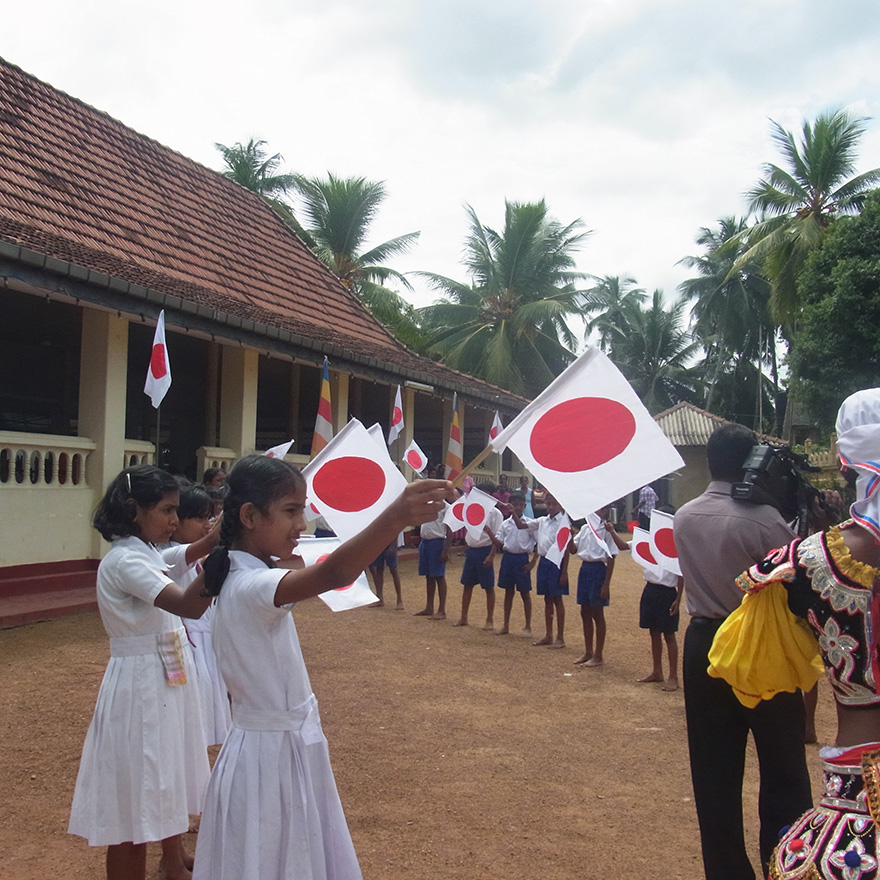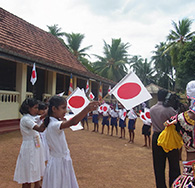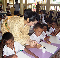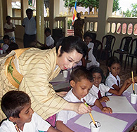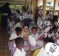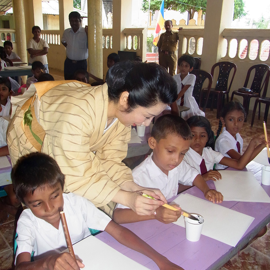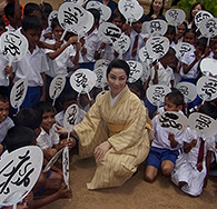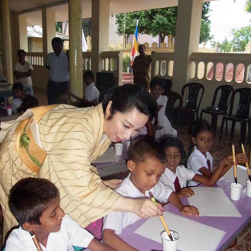 今回は、日本の震災にあった子供達へのメッセージとして、15世紀頃にできたといわれるスリランカの文字「シンハラ語」で「愛」を書いてもらいました。 スリランカにはないという日本伝統の「団扇」にも「愛」を書き、子供達はパワーあふれる素晴らしい作品を仕上げてくれました。